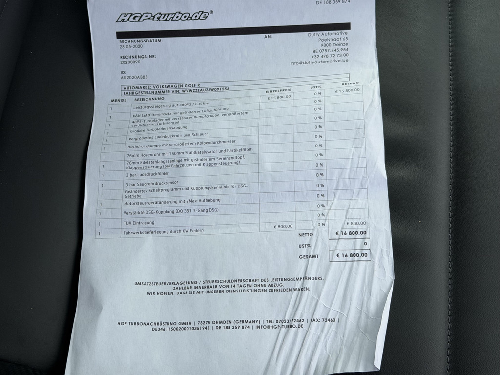 In perfecte staat verkerende VW Golf 7.5 R, in het prachtige Oryx Weiss Pearl, onder handen genomen door het welbekende HGP Turbo in Duitsland. Onderstaand zie je de uitgevoerde upgrades. Verder is de auto voorzien van originele volledig nieuw gemaakte (CNC afgedraaid en opnieuw gecoat) 19 inch Estoril velgen, wat ons betreft dé velg voor de Golf 7(.5) R. Ook zijn er 4 nieuwe Michelin Pilot Sport 5 banden gemonteerd en zijn de remklauwen gespoten in Lapiz Blue.